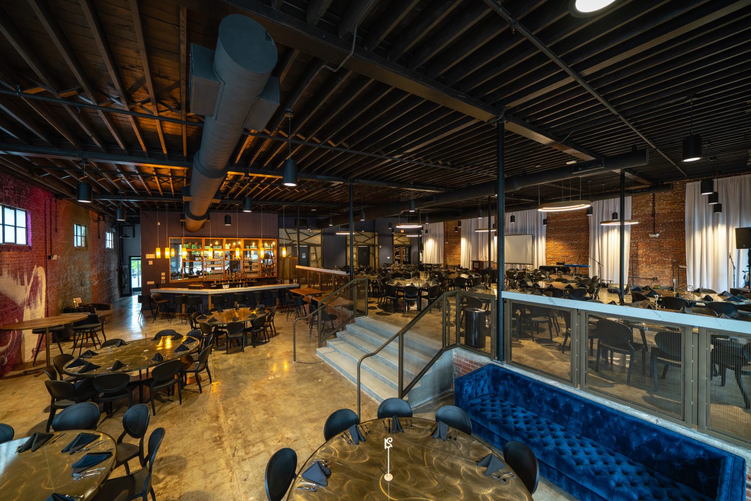 This 5,600 square feet of indoor and outdoor meeting space features brick walls, polished concrete floors, mid-century modern light fixtures and large window that flood the space in natural light.
